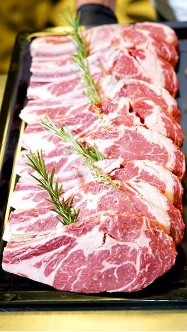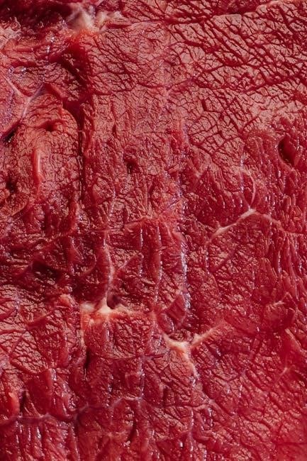 PDF charts illustrate how these primals are further divided into sub-cuts like roasts‚ steaks‚ and ground beef. Understanding primal locations helps predict cooking suitability; for example‚ the Rib primal yields tender‚ flavorful steaks‚ while the Round is leaner and better for braising. Detailed beef cuts diagrams are essential for butchers and cooks alike.